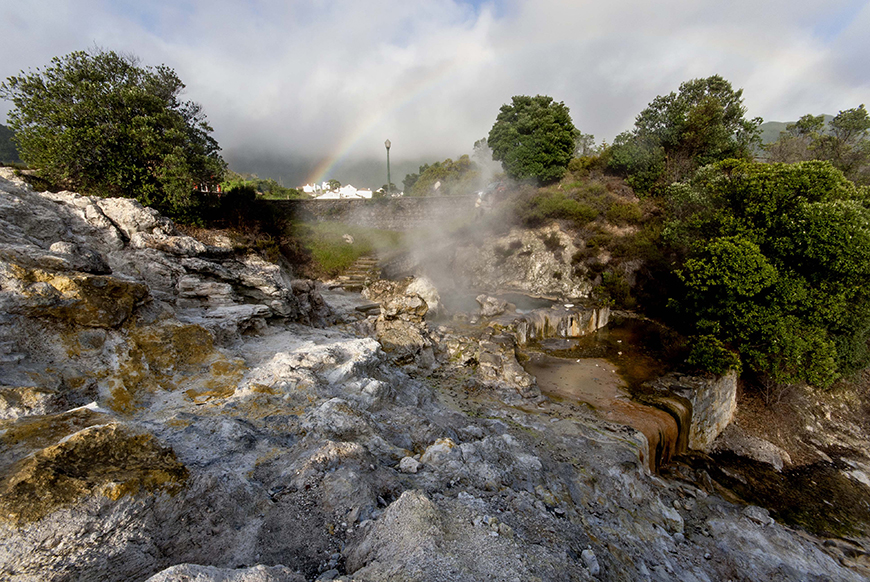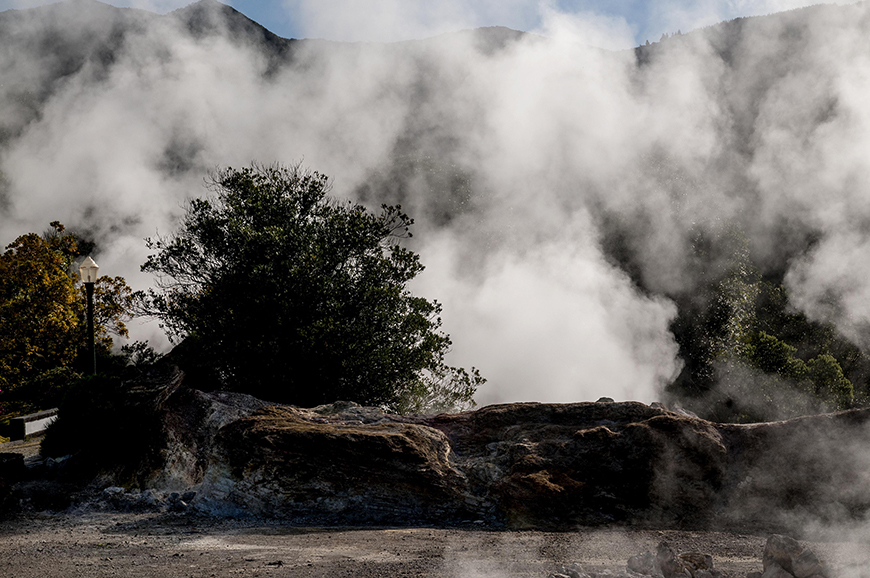 Descrição: As fumarolas são emanações de vapor de água e gases vulcânicos que emergem através de fissuras ou fraturas na crosta terrestre, geralmente em zonas de vulcanismo secundário. Nos Açores, ocorrem em áreas com calor residual do magma próximo da superfície, formando campos fumarólicos visíveis e ativos.