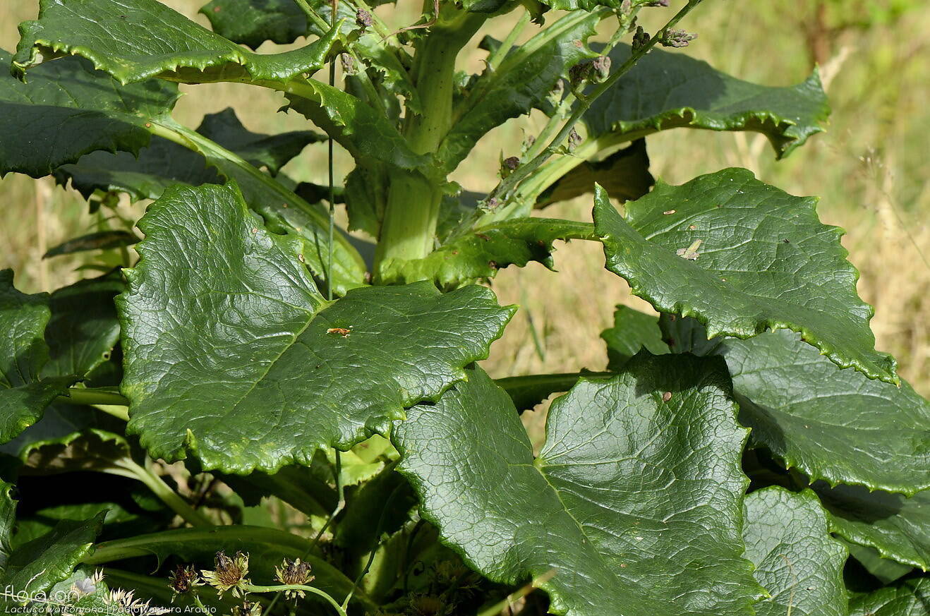 Descrição: Planta herbácea perene, da família das alfaces, com folhas grandes (mais de 20 cm), em forma de coração na base. O caule floral pode ultrapassar 1 metro de altura e termina numa grande panícula de flores brancas. O seu aspeto é elegante e facilmente reconhecível pela altura e pela forma das folhas.