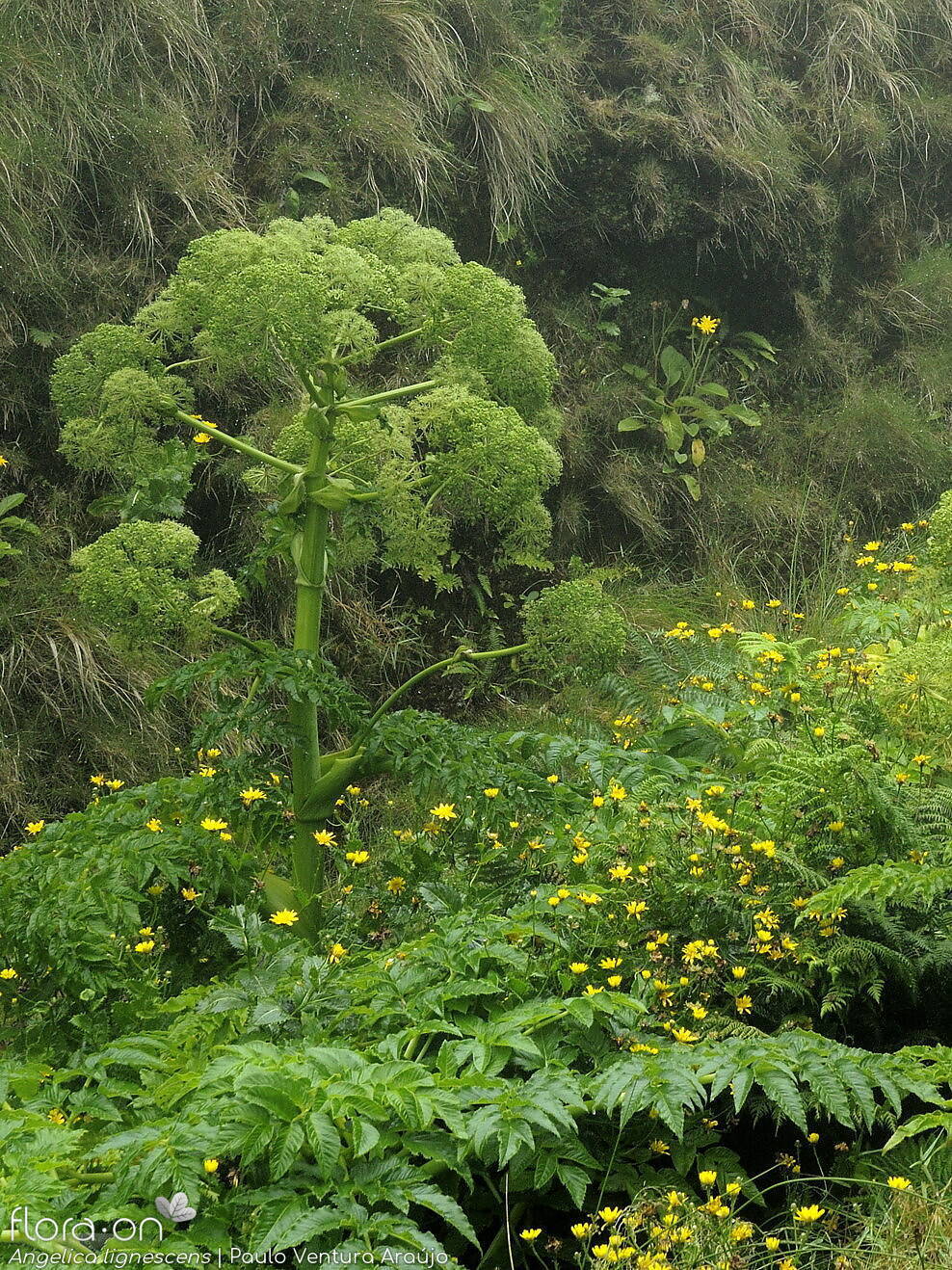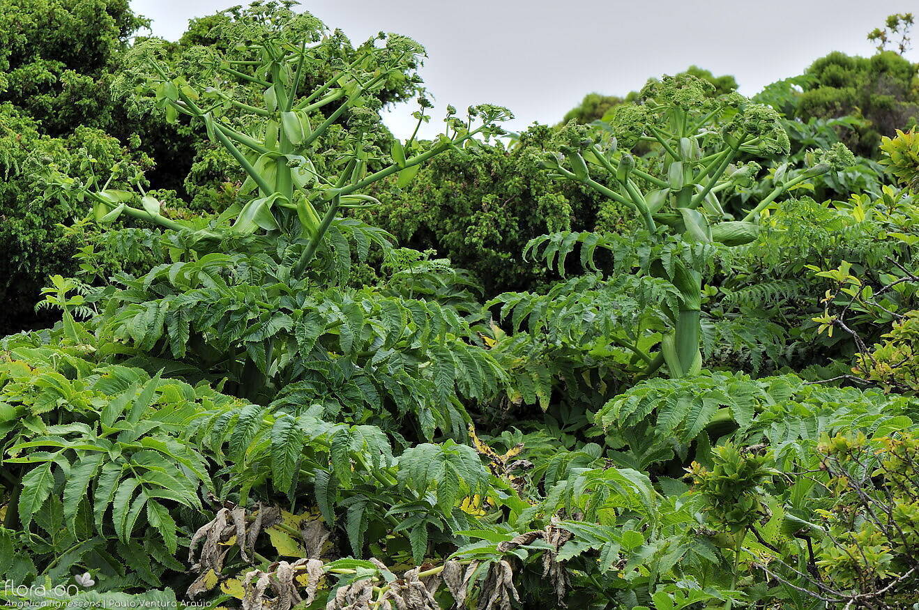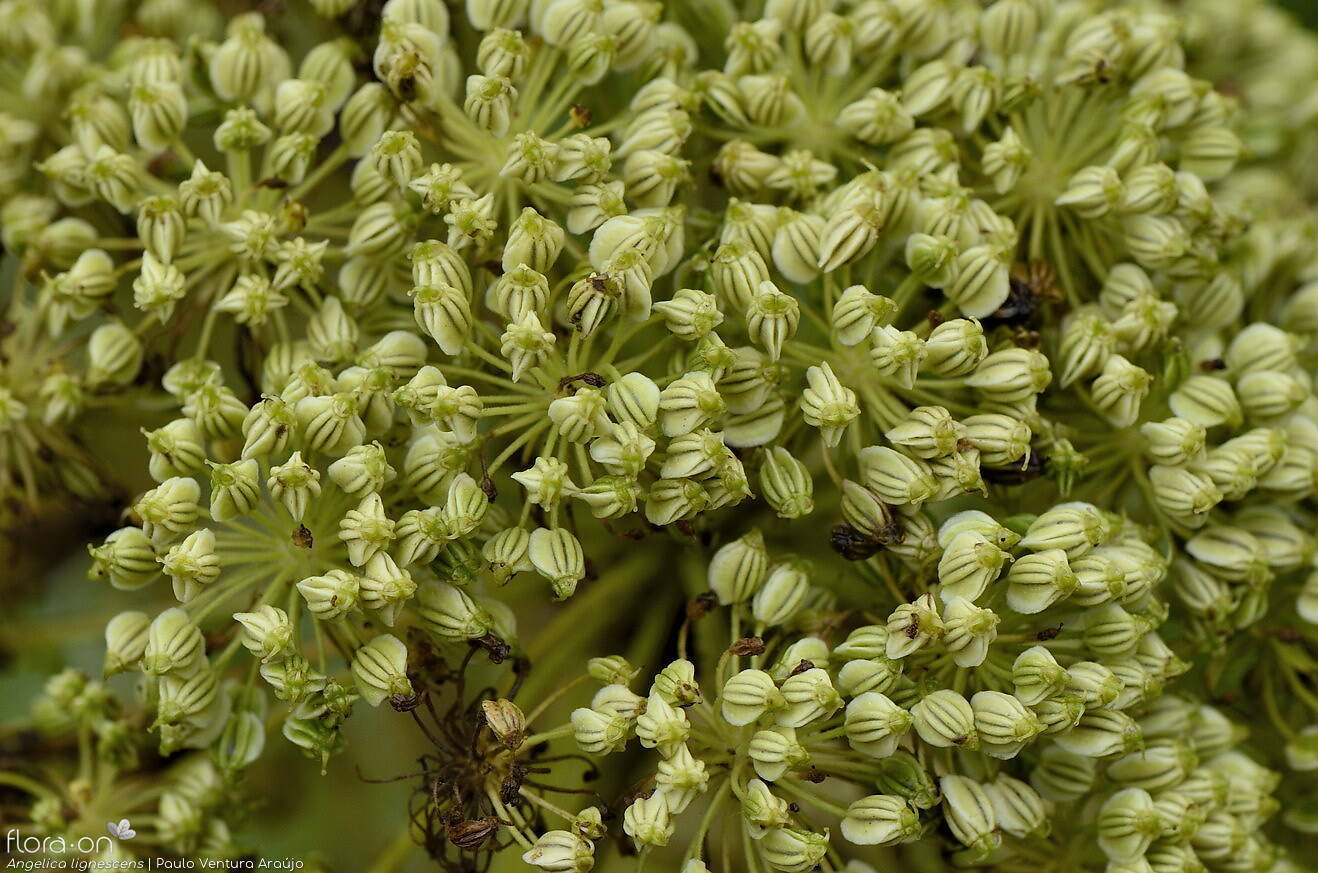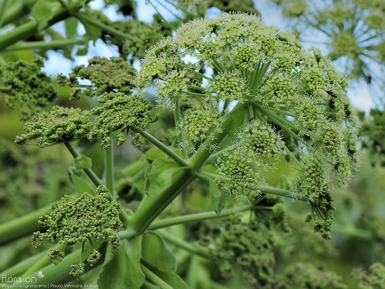 Descrição: Planta herbácea robusta e perene, com caules que podem atingir até 2,5 metros de altura. As folhas são grandes (cerca de 30×40 cm), divididas em várias partes (2 a 3 vezes pinadas). As flores agrupam-se em grandes umbelas (até 50 cm de diâmetro), geralmente de cor branco-amarelada. Os frutos são negros, com asas denticuladas