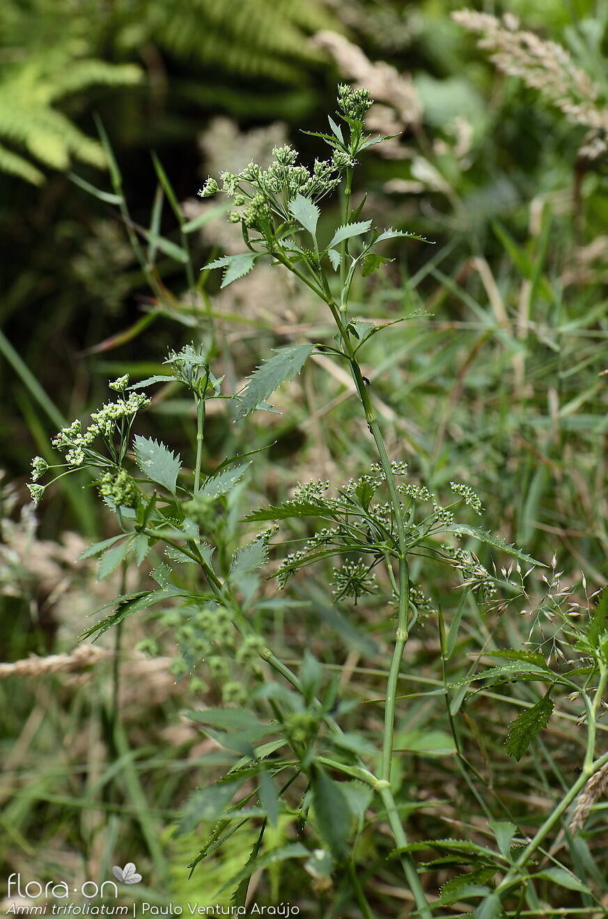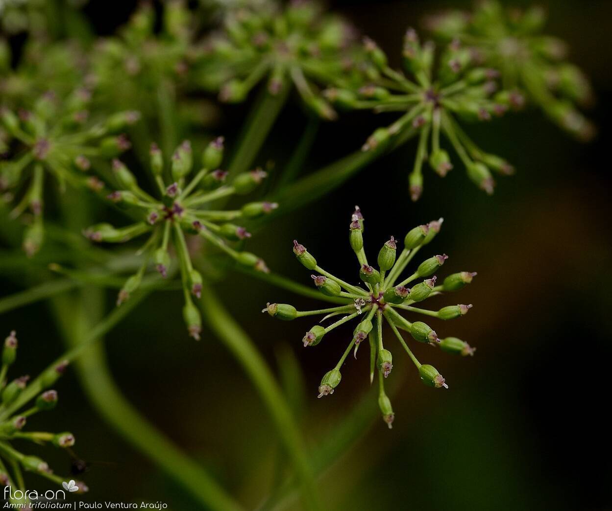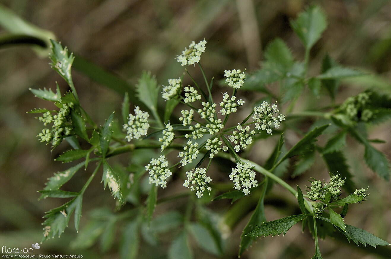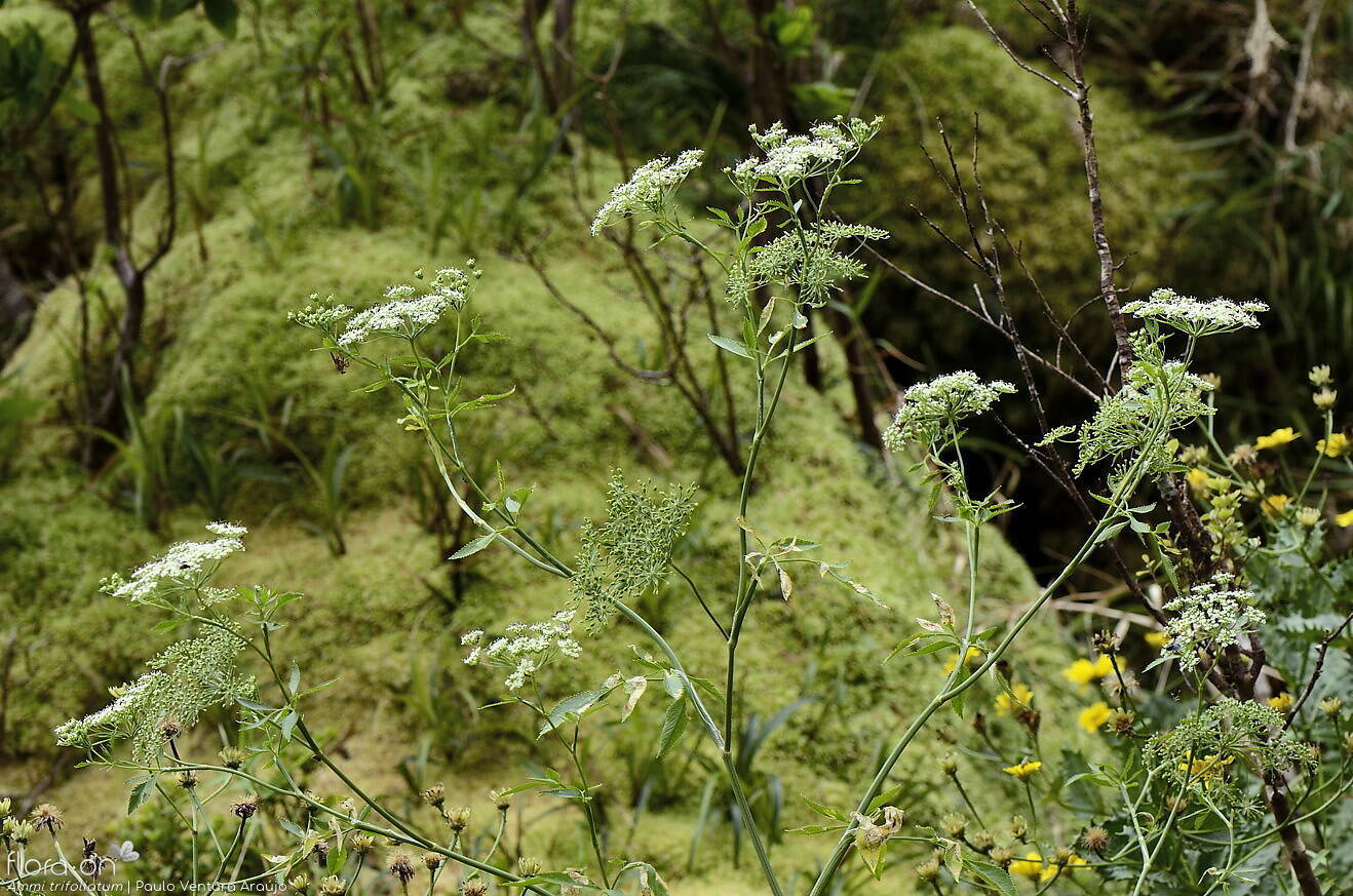 Descrição: Esta planta é herbácea, com caules verticais e firmes na base, que se ramificam na parte superior. As folhas são compostas, especialmente as da base, com divisões finas e bordas dentadas ou ligeiramente recortadas. As flores são pequenas, brancas, e agrupam-se em forma de guarda-chuva no topo dos caules. Os frutos são secos, de forma oval, medindo até cerca de 1,8 mm, e dividem-se em duas partes chamadas mericarpos.