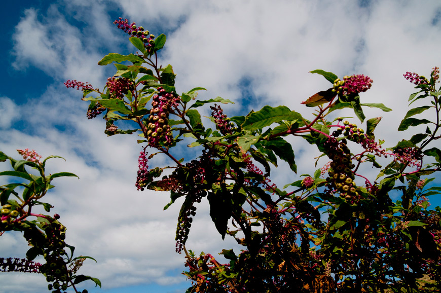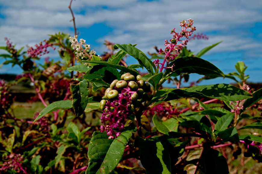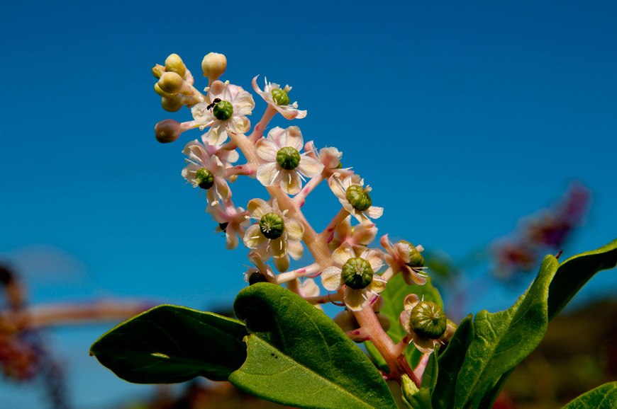 Descrição: Planta herbácea de grande porte, com folhas ovais e flores pequenas, esbranquiçadas, dispostas em espigas alongadas. Os frutos são bagas escuras e brilhantes, muito atrativas para aves, embora altamente tóxicas para humanos. A planta seca completamente no inverno e rebenta novamente a partir das raízes na primavera.