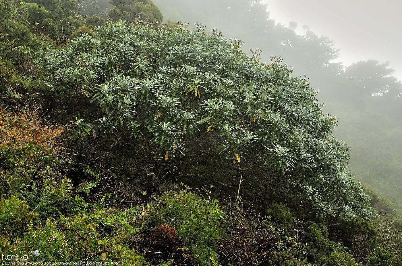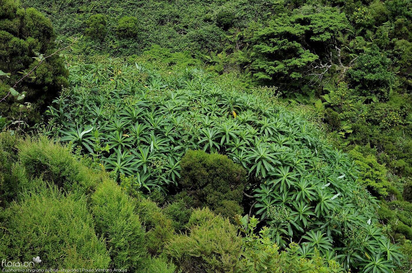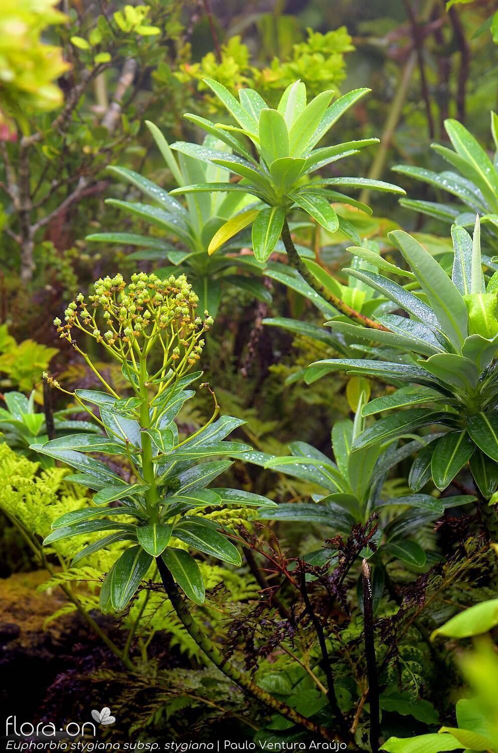 Ecologia: A Euphorbia stygiana cresce geralmente acima dos 600 metros de altitude, podendo atingir os 1100 metros. Prefere locais húmidos e abrigados, como ribeiras, crateras e rochas interiores, e pode também surgir em correntes de lava. É mais comum em florestas densas de louro e cedro, mas as populações são sempre pequenas e localizadas.