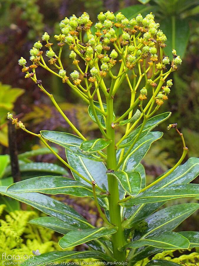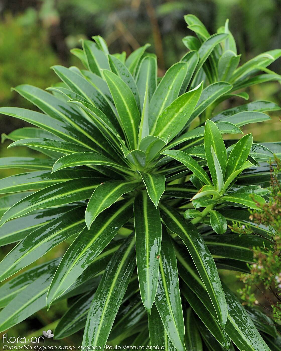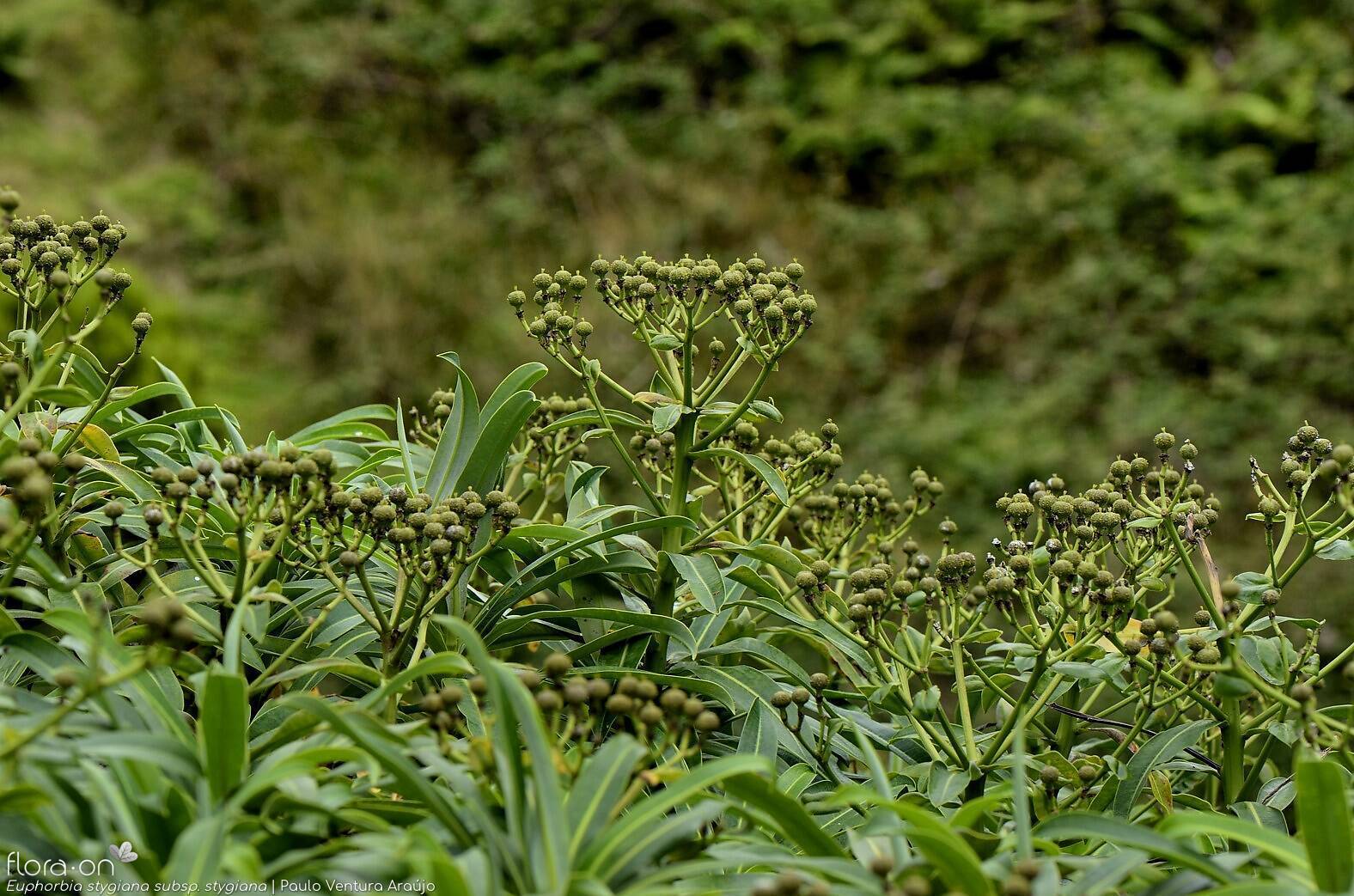 Ecologia: A Euphorbia stygiana cresce geralmente acima dos 600 metros de altitude, podendo atingir os 1100 metros. Prefere locais húmidos e abrigados, como ribeiras, crateras e rochas interiores, e pode também surgir em correntes de lava. É mais comum em florestas densas de louro e cedro, mas as populações são sempre pequenas e localizadas.