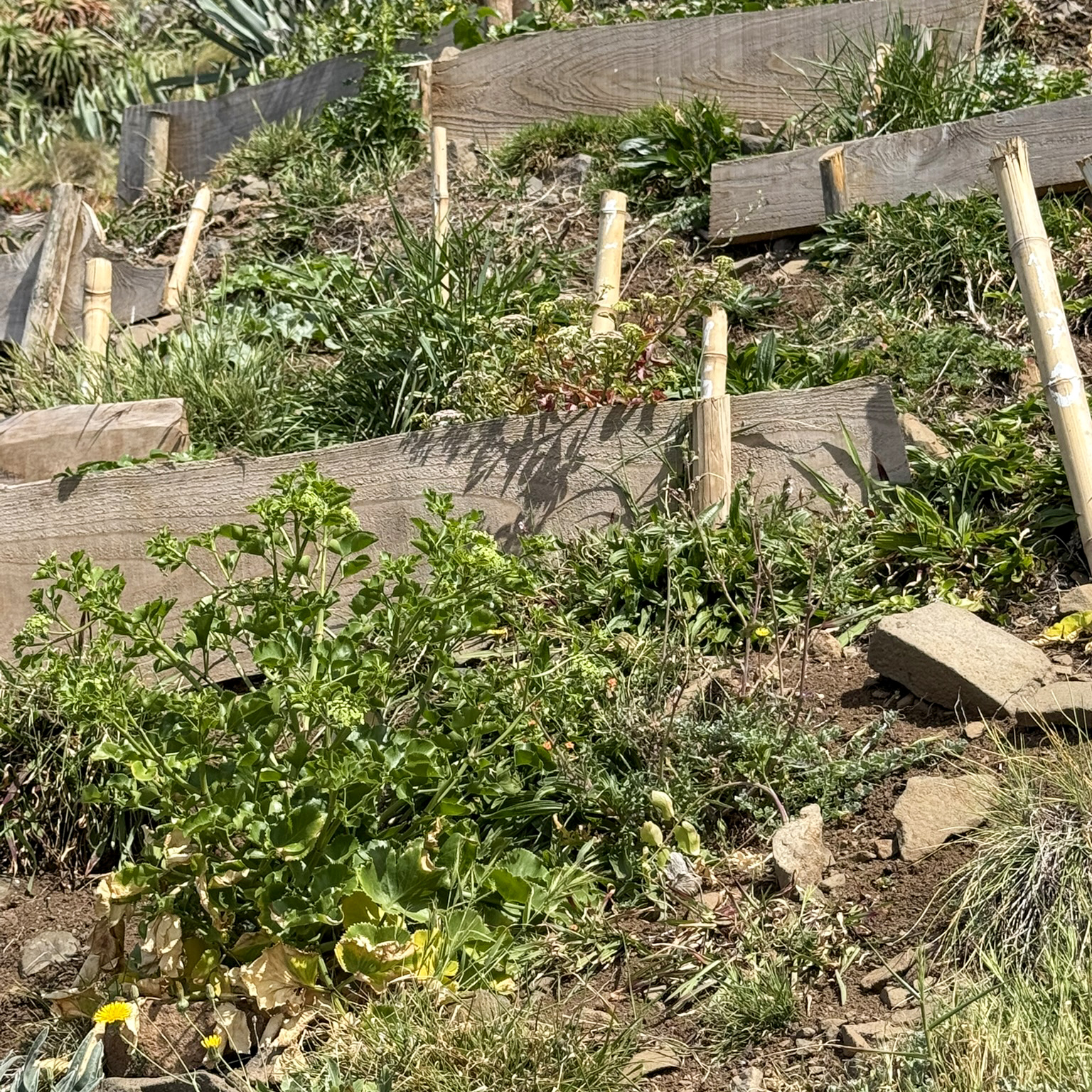 - Aichryson santamariense, plantada em janeiro de 2025, que também já floriu, tendo algumas plantas iniciado a frutificação.